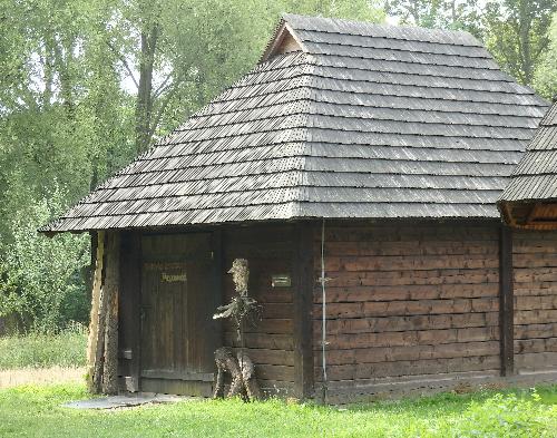 プシュチンスカ・リブニク地方のコビウルの馬車の倉庫。19世紀前半頃に建てられたもの。 小屋の壁は柱・厚板構造で、もともとは茅葺きの寄せ棟屋根であったが、移築後はシングル板材で葺かれている。小屋は表、裏の両側からは通行可能で、片開きの扉がついている。内部には干草が貯蔵された屋根裏部屋への扉がある。