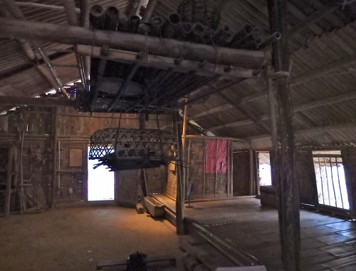 家の中では、高床式の床の部分が大きなベッドとなっており、大切なゲストを受け入れることもできる。人々は頭を窓に向けるようにして寝る。正面玄関近くは、家族が寝る部分である。奥の入り口近くには、背の低い壁で区切られた息子の嫁の寝室がある。 |