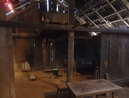 屋根は600枚の長さ1.2 m、幅0.3 m〜0.4 mの大きな帯状の板で覆われている。モン族は美しい麻の織物で知られ、白モン族は白い繊維をそのまま使い、独特の白色が保たれている。黒モン族や花モン族は、ろうけつ染めの藍布を刺繍でさらに美しく彩る。家の中に織り物や刺繍をする女性のために、屋根から光を取り込めるよう、いくつかの帯状の屋根板は移動することができるようになっている。