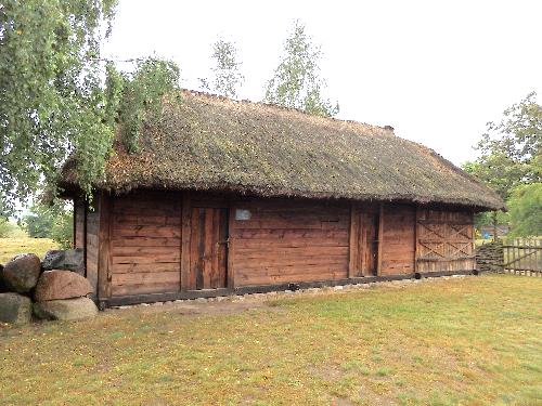 18世紀後半に建てられた。木造の畜舎。板張りの壁、隅棟を波型にした藁葺きの寄せ棟屋根。