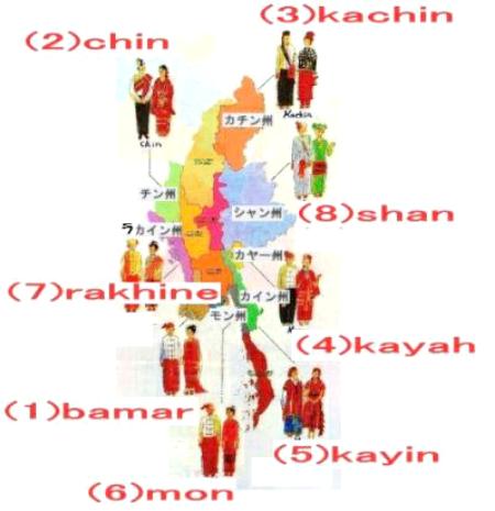 | ミャンマーでは、大きく8つの部族、全体で135に及ぶ民族が存在する。そして、それぞれの部族は、それぞれの州そして文化を持っている。 | |||