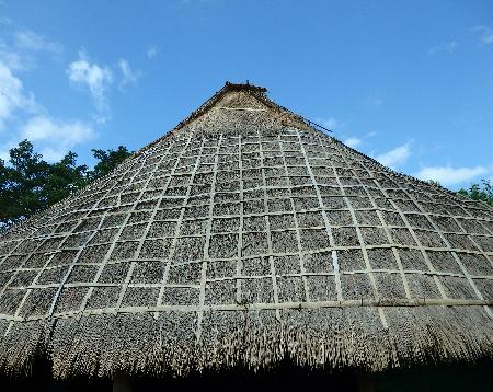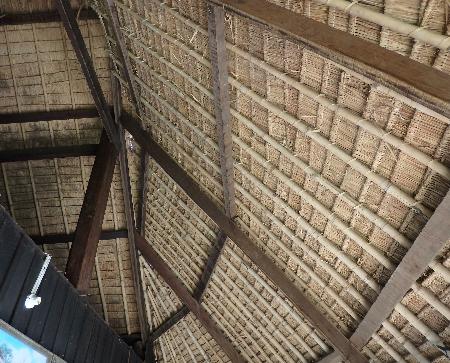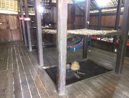 中央の棟下部分に囲炉裏が二つ一列に設けられている。 |
